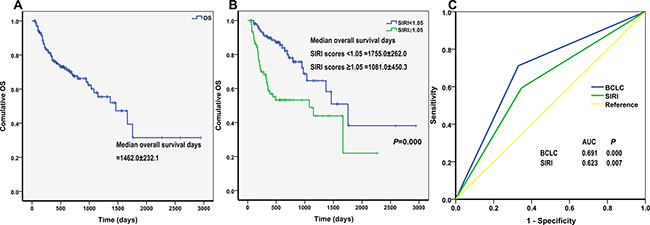 Although our study demonstrated that SIRI was a useful tool for predicting prognosis in HCC, some limitations should be considered when interpreting the results. First, the retrospective nature of the study and the small patient sample size might have generated biases in the analysis. Second, SIRI and BCLC stage were equally effective in predicting overall survival in HCC patients. Third, some clinical features, such as portal hypertension, tumor size, and TNM stage, were not considered in this study. A well-designed, large prospective study is therefore needed to confirm the relationship identified here between SIRI and HCC prognosis.