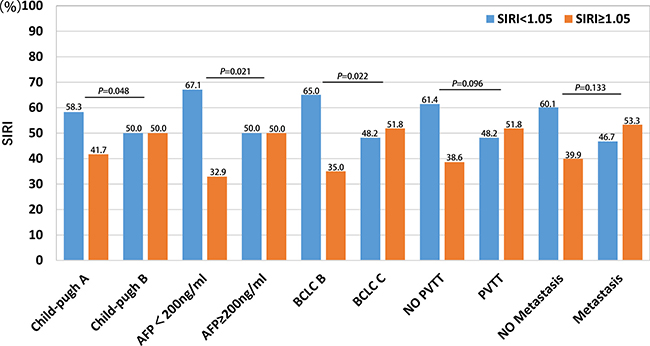 Figure 2: Comparison of SIRI in different HCC subgroups, including Child-pugh, AFP level, BCLC stage, PVTT and metastasis.
