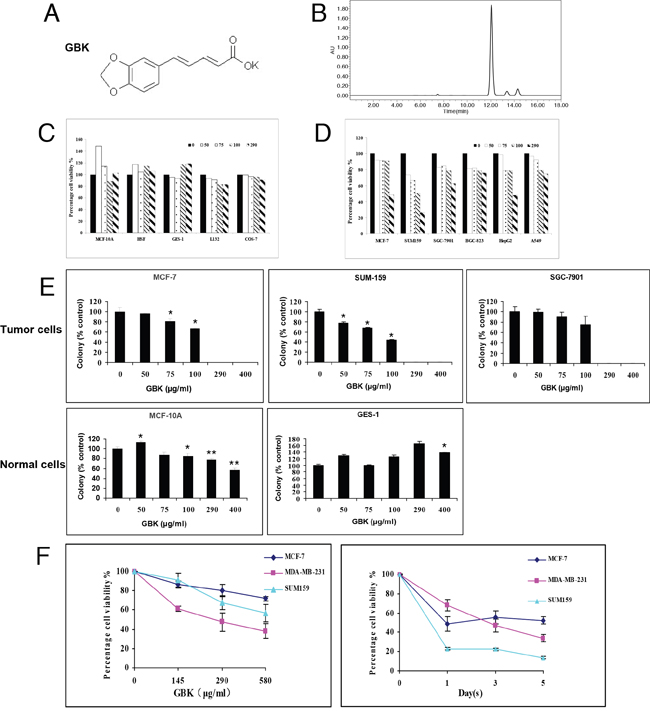 Figure 1: Selective killing effect of GBK in cancer cells. (A) Chemical structure of GBK. (B) The purity of synthesized GBK was measured by high-performance liquid chromatography (HPLC). The sample of GBK had only one sharp peak at 12 min as a retention time on the HPLC chromatogram. GBK was HPLC-purified (~99% purity) before the treatment. (C, D) Normal human cells, including human mammary epithelial cells (MCF-10A), human skin fibroblast cells (HSF), human gastric mucosa cells (GES-1), and human lung epithelial cells (L132), African green monkey kidney cells (COS-7), and human cancer cell lines, including human mammary cancer cells (MCF-7 and SUM159), human gastric cancer cells (SGC-7901 and BGC-823), human liver cancer cells (HepG2) and human lung cancer cells (A549), were grown in 96-well plates and treated with GBK at 0–290 μg/ml for 48 h. Cell viability was measured by CCK-8 assay. (E) Normal and tumor cells were treated with GBK at 0–400 μg/ml for 14 days, and live cells were stained by crystal violet. ddH2O was used as control. Columns show data expressed as means ± standard deviation (SD) of three independent experiments. *P < 0.05; **P < 0.01. (F) Cell viability of three human breast cancer cell lines treated with GBK was measured by CCK-8 assay. Independent experiments were repeated in triplicate; bars, SDs.