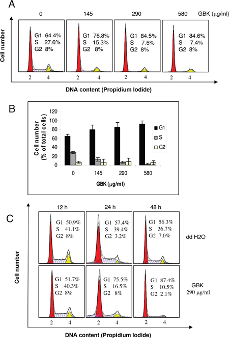 Figure 2: Induction of G1 arrest in GBK-treated MCF-7 breast cancer cells. (A, B) Proliferating MCF-7 cells were treated with different concentrations of GBK (0–580 μg/ml) for 48 h and cell cycle distributions were analyzed by flow cytometry. Representative flow cytometry data is shown in (A), and columns in (B) show the data expressed as means ± SD of three independent experiments. (C) Proliferating MCF-7 cells were treated with 290 μg/ml GBK for the indicated time and cell cycle distributions were analyzed by flow cytometry. ddH2O was used as control.