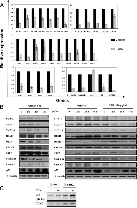 Figure 4: GBK induces cell cycle arrest at G1/S phase by downregulation of RNA and proteins important for G1-S phase transition in cancer cells. (A) Differential expression of genes in MCF-7 cells after treatment with GBK was analyzed by RT-qPCR. Genes related to replication and cell cycle were downregulated, while the tumor repressor gene p53 was upregulated. (B) Effect of GBK on the expression of cell cycle-related proteins in MCF-7 cells in dose-dependent and time-dependent experiments. MCF-7 cells were treated with various concentrations of GBK (0–580 μg/ml) for 48 h, or 290 μg/ml GBK in a time course. Protein lysates were analyzed by western blot. β-tubulin was used as an internal control. (C) Effect of GBK on G1 cell cycle regulatory complex formation. MCF-7 cells were treated with 290 μg/ml of GBK for 48 h. Total cell lysates were immunoprecipitated with anti-CDK2 antibody and analyzed by western blot analysis using anti-p27 and anti-CDK2 antibodies.