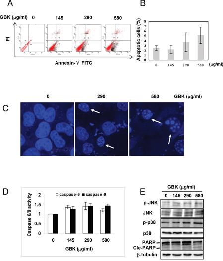 Our results revealed that the mechanism by which GBK induced apoptosis is via activating the caspase 6 and caspase 9-dependent pathway, and that p38/JNK MAPK signaling pathways also play a crucial role in the GBK-induced apoptosis. These results suggest that the anti-cancer effect of GBK is also associated with the induction of cell apoptosis.