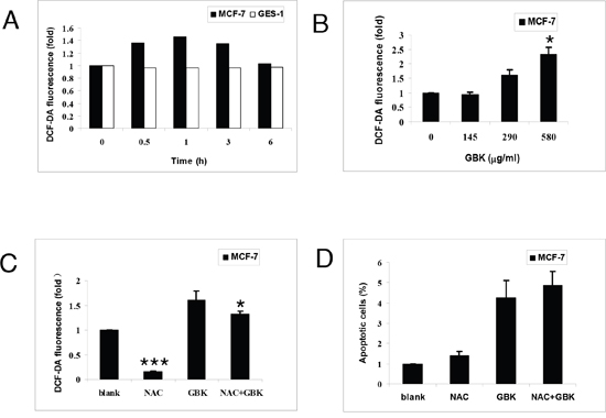 Figure 6: GBK enhances ROS accumulation in breast cancer cells. (A) Intracellular ROS generation induced by 290 μg/ml GBK treatment for 0–6 h in MCF-7 and GES-1 cells was measured by incubating with DCFH-DA (10 μM) and followed by flow cytometry analysis. (B) Intracellular ROS generation induced by increasing doses of GBK (0–580 μg/ml for 0.5 h) was measured in MCF-7 cells by incubating with DCFH-DA (10 μM) and flow cytometry analysis. (C) MCF-7 cells were pre-incubated with or without 5 mM NAC for 2 h before exposure to GBK (290 μg/ml) for 0.5 h. Intracellular ROS generation was measured by flow cytometry. (D) MCF-7 cells were pre-incubated with or without 5 mM NAC for 2 h before exposure to GBK (290 μg/ml) for 24 h. Percentage of cell apoptosis was determined by Annexin-V/PI staining and flow cytometry. Columns show the data expressed as means ± SD of three independent experiments. *P < 0.05; ***P < 0.001.