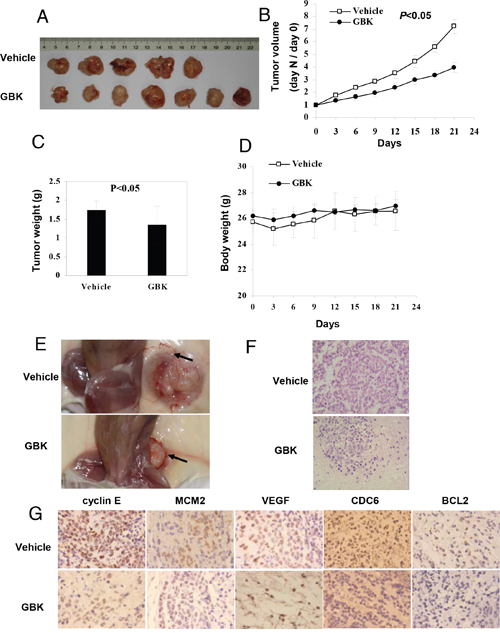 At day 21, mice were euthanized and tumors were excised and processed for histological examination. The vehicle-treated control mice showed severe malignant progression. In contrast, the tissues from GBK-treated mice showed a hyperplastic-like, non-malignant phenotype (Figure 7F). Immunohistochemical stainings of cyclin E, MCM2, VEGF, CDC6 and BCL2 were performed in tumor tissues, and the staining intensities of cyclin E, MCM2, CDC6 and BCL2 were decreased in the GBK treatment group in xenograft-tumor mice compared to the control group (Figure 7G). The vehicle-treated tumor sections showed high expression of VEGF, but no obvious level of staining was observed in the GBK-treated tissue sections (Figure 7G). These results revealed a potent inhibitory effect of GBK on MCF-7 tumor growth in vivo.