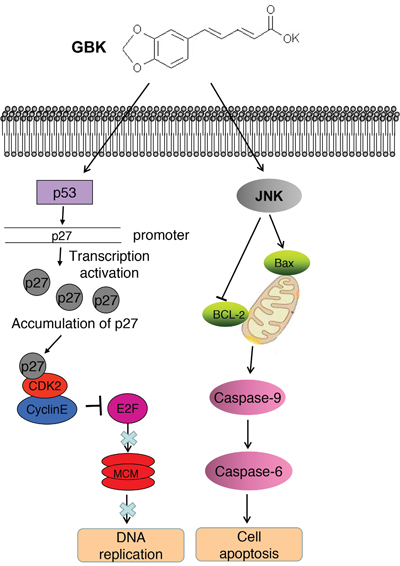 Figure 8: The model for the role of GBK in inhibiting breast tumorigenesis. GBK selectively inhibits the G1-S-phase transition in breast cancer cells by induction of the CDK inhibitor p27 expression as well as inhibition of cyclin E/CDK2 complex activities. In turn, MCM proteins are markedly downregulated in MCF-7 cells treated with GBK. GBK also kills breast cancer cells by inducing cell apoptosis through JNK signaling.