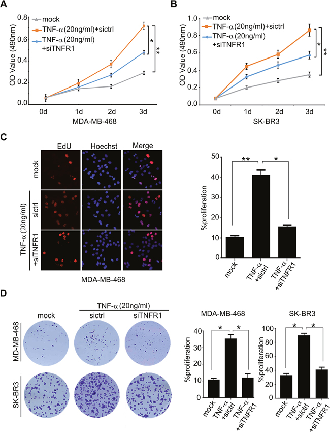 Figure 1: TNF-α administration is able to promote the proliferation of breast cancer cells through activating TNFR1. (A, B) Effect of TNF-α on cell proliferation was measured by MTT assays in MDA-MB-468 and SK-BR3 which were added into 20 ng/ml TNF-α and transiently transfected with si-TNFR1, respectively. (C) Effect of TNF-α on cell proliferation was determined by EdU assays in MDA-MB-468 cells added into 20 ng/ml TNF-α and transiently transfected with si-TNFR1. (D) Effect of TNF-α and si-TNFR1 on the clonogenicity of MDA-MB-468 and SK-BR3 cells was examined by monolayer colony formation assays. Error bars represent ±s.d., *p < 0.05, **p < 0.01, Student’s t test. All experiments were repeated at least 3 times.