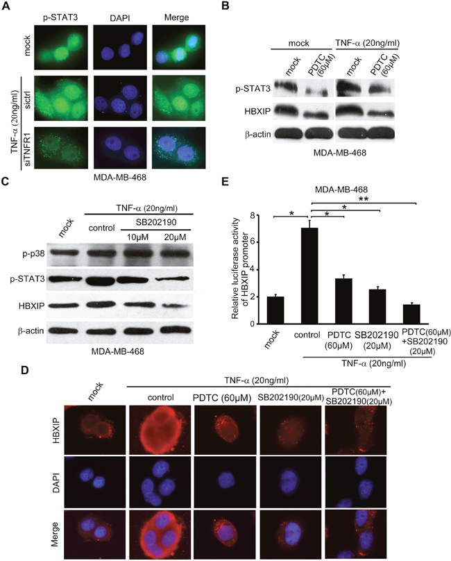 TNF-α enhances STAT3 phosphorylation via NF-κB and/or p38 signaling in activation of HBXIP promoter
