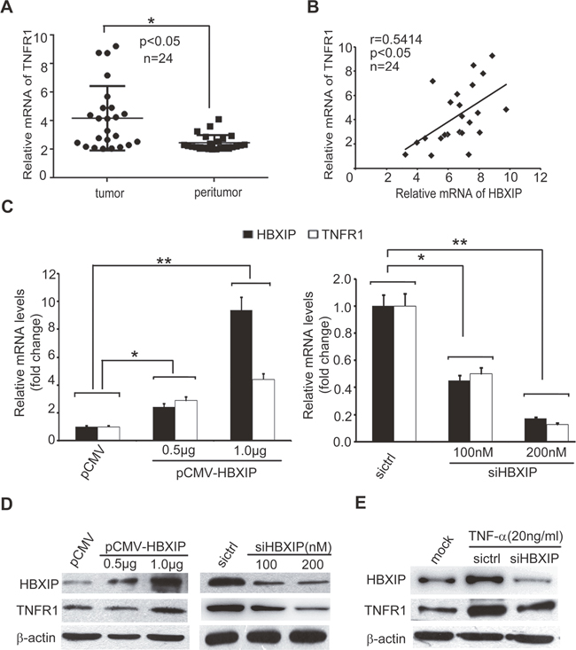 Each experiment was repeated at least 3 times. Statistical significance was assessed by comparing mean values (± sd) using a Student’s t test for independent groups and was assumed for p<0.05 (*), p<0.01 (**), p<0.001 (***) and not significant (ns). The expression levels of TNF-α and TNFR1 in breast cancer tissues and their corresponding peritumor tissues were analyzed using the Wilcoxon signed-rank test. Pearson's correlation coefficient was used to determine the correlation between HBXIP and TNF-α or TNFR1 mRNA levels in breast cancer tissues.