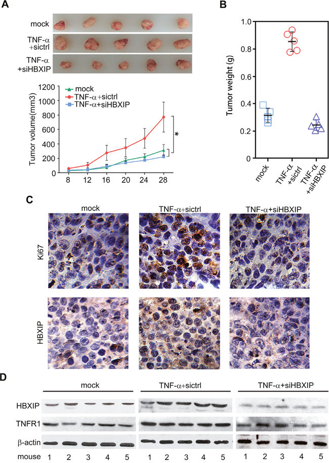 Figure 7: TNF-α promotes the growth of breast cancer through HBXIP in vivo. (A) The tumors in each group were shown in up panel. The growth curve of tumors in nude mice transplanted with MDA-MB 468 cells was shown in down panel (n=5). (B) The tumor weight in each group was shown. (C) The expression of Ki67 and HBXIP was detected by immunohistochemistry assays in tumor tissues from mice. (D) The expression levels of HBXIP and TNFR1 were examined by Western blot analysis in the tumor tissues from mice. Error bars represent ±s.d., *p< 0.05, Student’s t test. All experiments were applied at least 3 times.