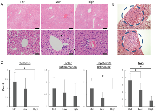 Figure 1: Effects of tofogliflozin on the development of pre-neoplastic lesions and histopathology in the liver of the experimental mice. (A) Representative photomicrographs of hepatic pre-neoplastic lesions, foci of cellular alteration (FCA). (B) Representative photomicrographs of H&E staining at high-power field (upper panels; bars, 200 μm) and low-power field (lower panels; bars, 50 μm) of liver sections from the DEN alone-treated control mice (Ctrl), low-dose tofogliflozin-treated mice (Low), and high-dose tofogliflozin-treated mice (High) at the end of experiment. Ballooned hepatocytes are indicated by the black arrows. (C) Presence of NAFLD activity score (NAS; steatosis, inflammation, and ballooning) was determined using histopathological analysis. Values are expressed as mean ± SD. *P < 0.05.