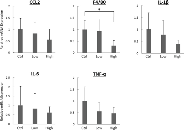 The effects of tofogliflozin on mRNA expression levels of specific molecules associated with hepatic inflammation were examined using quantitative real-time reverse transcription-polymerase chain reaction (qRT-PCR) analysis. As shown in Figure 2, the high-dose tofogliflozin-treated mice showed a significant decrease in mRNA expression levels of macrophage marker F4/80 (P < 0.05). Since macrophages in the liver secrete pro-inflammatory cytokines and increase in parallel with the disease progression of mice steatohepatitis, F4/80 can be considered as a kind of marker for liver inflammation [25, 26]. Administration of high-dose tofogliflozin also decreased the mRNA expression levels of other inflammatory markers such as chemokine (C-C motif) ligand 2 (CCL2), IL1-β, IL-6, and TNF-α, but the differences were not statistically significant (P > 0.05).