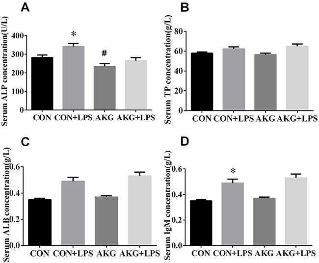 To explain the physiological effects of AKG on the weaned piglets, The serum levels of biochemical parameters were determined as a reflection of the metabolism and visceral organ status of pigs in response to Escherichia coli lipopolysaccharide (E.coli LPS) challenge (Figure 1). The results showed that neither diets nor LPS challenge affected (P > 0.05) the concentration of serum total protein (TP) (Figure 1B) and total albumin (ALB) (Figure 1C) by pigs. However, compared with pigs fed the basal diet, the concentration of alkaline phosphatase (ALP) (Figure 1A) in pigs fed the AKG diet decreased (P<0.05) by 16.8 %. Moreover, LPS challenge remarkably increased (P < 0.05) the concentrations of ALP and immunoglobulin M (IgM) (Figure 1D) in piglets both the basal diet and AKG diet. There is no LPS challenge × diet interaction effect (P < 0.05) in the concentrations of serum variables.