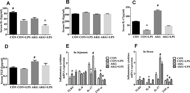 Inflammatory cytokines comprise a major immune defense system for preventing organ injury in response to inflammatory stimulus, such as interleukin 2(IL-2), interleukin 8 (IL-8), interleukin 10(IL-10), interleukin 17(IL-17), and transforming growth factor–β (TGF-β). Neither diets nor LPS challenge affected serum IL-8 (Figure 2B) concentration AKG supplementation significantly reduced (P < 0.05) the concentration of IL-2(Figure 2A) by 18.3%, but remarkably enhanced (P < 0.05) the content of IL-17(Figure 2C) and TGF-β (Figure 2D) by 83.5% and 35.9%, respectively, when compared with the basal diet. Furthermore, serum concentration of IL-2 and IL-17 were greatly affected (P < 0.05) by LPS challenge. No LPS challenge × diet interaction was observed in the secretory of serum inflammatory cytokines. This results indicated that LPS stimulated the secretory of inflammatory cytokines in the weaned piglets, while the addition of AKG improves anti-inflammatory cytokines to defend the inflammation.