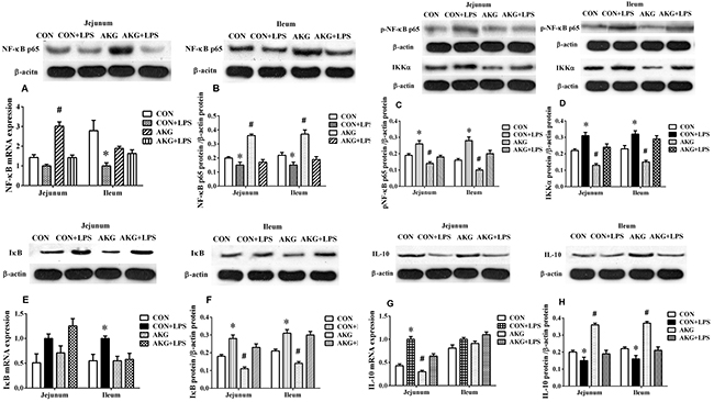 To further investigate whether AKG activation sensitizes piglets to the NF-κB-mediated inflammatory pathway, we determined the expression of the NF-κB pathway related key proteins using the Western blot technique. The results showed that LPS challenge increased (P < 0.05) the phosphorylation expression level of NF-κBp65 protein (Figure 4C), while decreased (P < 0.05) the expression of NF-κB p65protein (Figure 4B) in the jejunum and ileum of piglets fed the basal and AKG diets. Dietary supplementation with AKG increased (P < 0.05) the expression of NF-κBp65 and IL-10 (Figure 4H) proteins in the jejunum and ileum of both saline- and LPS-treated piglets but decreased the expression of phosphorylated NF-κBp65, inhibitor of nuclear factor kappa-B kinase α(IKKα) (Figure 4D) and IκB (Figure 4F) proteins. These results suggest that the LPS-challenged piglets are significantly susceptible to AKG mediated changes in NF-κB pathway, in which corroborate previous observations that AKG protects against LPS mediated NF-κB pathway.