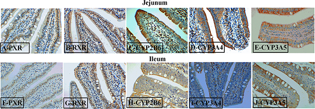 Since LPS challenge results in increased mucosal permeability and bacterial translocation [16], so it is logical to conclude that the state of activation of intestinal epithelial PXR is paramount in determining the initial events leading to the observed CYP450 expression. The regulatory effect of AKG on the PXR-regulated detoxification pathway in intestinal inflammatory model remain largely unknown. Hence, we attempted to link AKG metabolism to the expression levels and localization of PXR and its downstream targets using the immunohistochemical and Western blot technique. We found thatPXR and RXRa were mostly located in the nucleus of epithelial cell in jejunum and ileum, however, its downstream targets (CYP2B6, CYP3A4 and CYP3A5) were widely observed in the cytoplasm of epithelial cell in the intestine. As noted previously, the NRs often have a similar pattern of tissue distribution [3] and our results further confirmed it.