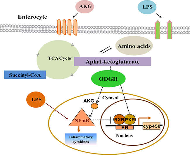 Figure 8: Interactions between PXR and NF-κB pathway modulated by AKG in intestine. LPS triggers the activation of NF-κB-mediated inflammatory pathway and promotes the secretion of inflammatory cytokines. AKG supplementation facilitates intracellular AKG metabolism with concomitant absorption and transport of intestinal nutrient, which co-administrate to enhance the expression of ODGH in the TCA cycle and generate large amounts of ATP for maintaining gut homeostasis. Thus AKG could reverse the adverse effects induced by LPS and inhibit the NF-κB-mediated inflammatory pathway activity, which then would directly or indirectly enhance PXR signal, although AKG is not a known PXR ligand. One potential mechanism for the up-regulation of the PXR-regulated detoxification pathway is through the down-regulation of NF-κB pathway by AKG interaction which in turn de-represses the PXR-associated gene and protein expression, thereby improving intestinal immunity. ER: endoplasmic reticulum.