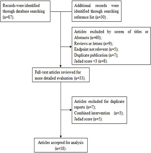 Figure 1 illustrates the search process and the final selection of relevant studies. A total of 87 records were identified through database searching, and 30 additional records were identified through examination of reference lists. On the basis of the titles and abstracts, we identified 33 full-text articles. After further evaluation, 15 studies were excluded due to the lack of available data, duplicated reports, and Jadad score < 3. Finally, 18 [12–29] eligible studies published between 1987 and 2015 were identified, including 11 case-control studies [14, 15, 17, 20, 22–26, 28, 29] and 7 cohort studies [12, 13, 16, 18, 19, 21, 27] (Figure 2). Of the 18 included studies, 8 were conducted in USA [16, 17, 19, 20, 24, 26, 27, 29]; 2 in Australia [15, 22]; 2 in Italy [25, 28]; and 1 in Netherlands, Europe, Denmark, Canada, Sweden, and China [12–14, 18, 21, 23]. A total of 701,857 female subjects, including 8,683 ovarian cancer cases, were included. Most studies matched or adjusted for some potential confounders, including age, education, total energy intake, and use of oral contraceptives (OCPs). The Jadad scores for the included studies ranged from 3–5. Table 1 summarizes the quality scores of the cohort studies and case-control studies.