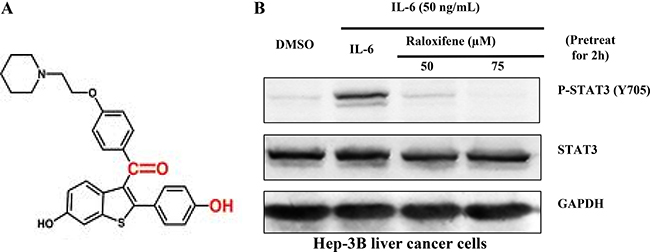 Figure 1: (A) The structure of Raloxifene. Raloxifene (marketed as Raloxifene by Eli Lilly and Company) is an oral-selective estrogen receptor modulator (SERM) that has estrogenic actions on bone and anti-estrogenic actions on the uterus and breast. (B) Raloxifene inhibits STAT3 phosphorylation induced by IL-6 in Hep-3B liver cancer cell-lines. With Raloxifene (50, 75 μM) pretreated for 2 h and IL-6 induced for 30 min, P-STAT3 was inhibited in a dose-dependent manner.