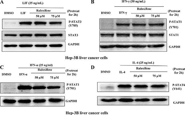 Figure 2: Raloxifene did not affect the phosphorylation of STAT3 on Tyr705 or other STATs induced by other cytokines. Raloxifene did not inhibit the phosphorylation of STAT3 on Tyr705 induced by (A) LIF, did not inhibit the phosphorylation of STAT1 on Tyr701 induced by IFN-γ (B) and IFN-α (C), and did not inhibit STAT6 phosphorylation on Tyr641 induced by IL-4 (D) in Hep-3B liver cancer cells. With pretreated with Raloxifene for 2 h followed by cytokines inducing for another 30 min, western blot was used to evaluate the phosphorylation of STAT3, STAT1 and STAT6.