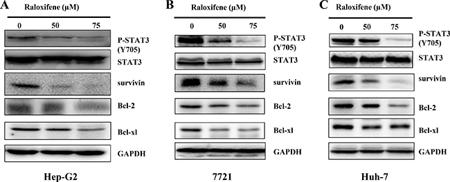To detect the inhibitory effect of Raloxifene on persistent STAT3 phosphorylation, Hep-G2 (Figure 3A), 7721 (Figure 3B) and Huh-7 (Figure 3C) cancer cell-lines, which elevates the levels of STAT3 phosphorylation, were treated with Raloxifene (50, 75 μM) for 24 hours. Western blot analysis showed that Raloxifene inhibited persistent STAT3 phosphorylation. We also examined the expression of STAT3 target genes, such as Bcl-2, Bcl-xl, and survivin in liver cancer cells by western blot. With the treatment of Raloxifene for 24 hours, the expression of Bcl-2, Bcl-xl, and survivin was reduced in Hep-G2 (Figure 3A), 7721 (Figure 3B), and Huh-7 (Figure 3C) liver cancer cell-lines.