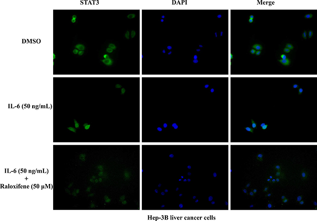 Figure 5: Raloxifene inhibited STAT3 translocation to nucleus induced by IL-6 in Hep-3B cancer cells. After serum-free overnight, Hep-3B liver cancer cells were pretreated with Raloxifene for 2 h, followed by IL-6 (50 ng/mL) induced for another 30 min, then processed of STAT3 nuclear translocation detection by immunofluorescence staining.
