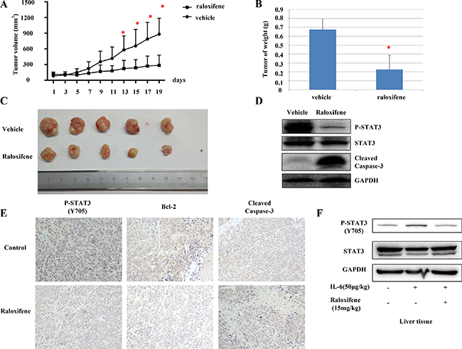 Figure 7: Raloxifene suppressed tumor growth of liver cancer cells in vivo. Raloxifene decreased cell volume compared with vehicle group. The next day after Hep-G2 cancer cells injected, the mice were randomized to give daily oral dosages of 15 mg/kg of Raloxifene or vehicle control for 19 days and tumor volumes were determined every other day (A). After tumors harvested, weighed every tumor by electronic scale (B) and determined the volumes of tumors (C). Raloxifene inhibited P-STAT3 but not total STAT3, and induced caspase-3 cleavage in mouse xenografts in vivo (D). Raloxifene also inhibited STAT3 phosphorylation, decreased the expression of Bcl-2 and induced apoptosis as shown by IHC staining (E). Raloxifene (15 mg/kg) pretreated for 24 hours and IL-6 injected for another 2 hours in nude mice, then P-STAT3 of liver tissues was detected by western blot (F). Raloxifene suppressed the phosphorylation of STAT3 induced by IL-6 in liver tissues of nude mice, which indicated Raloxifene could inhibited IL-6/STAT3 signaling in vivo with one dose of 15 mg/kg.