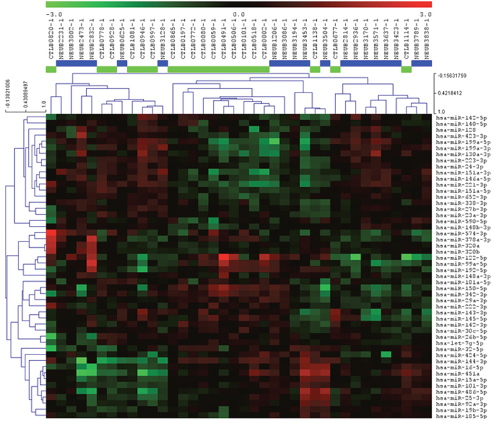 Figure 1: Heatmap and unsupervised hierarchical clustering. The heat map shows the result of the two-way hierarchical clustering of miRNAs and samples. Each row represents a single miRNA, and each column represents one sample. The miRNA clustering tree is shown on the left. The color scale shown at the top illustrates the relative expression level of a single miRNA across all samples: red color represents an expression level above mean, green color represents expression lower than the mean. The clustering is performed on all samples, and on the top 50 miRNAs with highest standard deviation. Normalized (dCt) values have been used for the analysis (n=38).