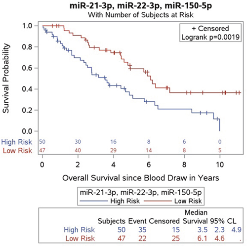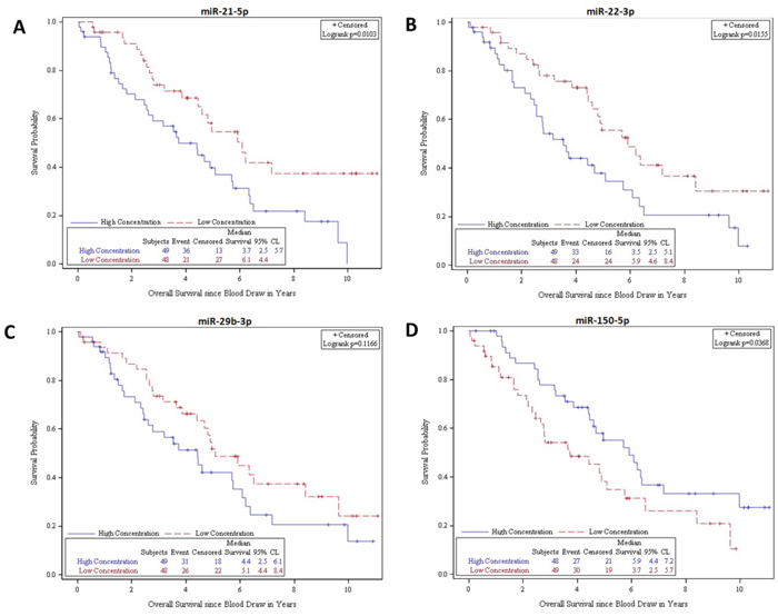 Non-parametric Wilcoxon rank sum test was performed to compare the patient and control groups. Descriptive statistics of patient clinical features were tabulated by the dichotomized expression level of 4-miRNA panel at median, and compared by Wilcoxon rank sum test, chi-square test, or fisher's exact test when applicable. The distribution of survival times by dichotomized 4-miRNA panel were assessed using Kaplan-Meier methods and log-rank tests, and then the association was evaluated by Cox proportional hazards regression. Multivariate models were adjusted for age and blood draw, gender, race (white or otherwise), tumor differentiation, and treatment naive or otherwise prior to blood draw. Proportional hazard assumptions were verified by testing for a nonzero slope of scaled Schoenfeld residuals on ranked failure times. In addition, Pearson's correlation was applied to determine the association between all pairs in the 4-miRNA panel. Analyses were conducted using SAS version 9.4 (SAS Institute, Cary, NC). Two-sided p-values <0.05 were considered statistically significant.