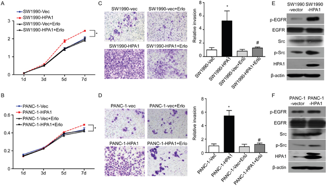 Endogenous HPA1 levels and subcellular location in different PC cell lines were detected by western blotting and immunofluorescence, respectively (Supplementary Figure 2A and 2B). Our results showed that HPA1 was mainly localized in the cytoplasm of PC cells. To further study the role of HPA1 in PC cells, PANC-1 and SW1990 cells were transfected with HPA1 lentiviral activation particles (designated as PANC-1-HPA1 and SW1990-HPA1). Over-expression of HPA1 was confirmed by qRT-PCR (Supplementary Figure 2C and 2D). We then tested the effect of HPA1 on the proliferation of PC cells. Both SW1990-HPA1 and PANC-1-HPA1 cells showed a higher growth rate than the corresponding control cells (Figure 2A and 2B). A cell invasion assay was used to evaluate invasive potential of these cells. SW1990-HPA1 and PANC-1-HPA1 cells invaded to the bottom were significantly increased (approximately 5.3 and 5.5-fold increase, respectively) compared with control (Figure 2C and 2D). In addition, knockdown of HPA1 expression could inhibit invasion of PANC-1 cells (Supplementary Figure 3A and 3B). However, over-expression of HPA1 did not influence the sensitivity to gemcitabine of SW1990 cells (Supplementary Figure 4). To explore the underlying molecular mechanism of HPA1-induced growth and invasion, we detected the expression of epithelial-mesenchymal transition (EMT) markers (E-cadherin, Vimentin, Zeb-1 and Snail) in HPA1 over-expression PC cells. The results showed that over-expression of HPA1 leads to elevated expression of Vimentin, Zeb-1 and Snail and reduced expression of E-cadherin, although the effect was limited (Supplementary Figure 2C and 2D). We then detect the activation of EGFR signaling in HPA1 over-expression PC cells, as the EGFR signaling plays a fundamental role in PC [18, 19]. We found that overexpression of HPA1 significantly promoted phophorylation of EGFR in SW1990 and PANC-1 cells (Figure 2E and 2F). We further detected the downstream signaling following activation of EGFR. The results showed overexpression of HPA1 remarkably increase phosphorylation of Src (Figure 2E and 2F) but not ERK1/2, Stat3 or Akt (Supplementary Figure 3C). In addition, blocking EGFR signaling with erlotinb could abolish HPA1-induced proliferation (Figure 2A and 2B) and invasion (Figure 2C and 2D) of PC cells.