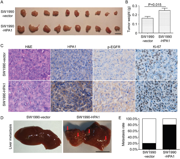 Figure 3: HPA1 promotes the growth and metastasis of PC cells in vivo. SW1990 cells transfected with HPA1 or empty vector were injected subcutaneously into BALB/c nude mice. Mice were sacrificed 14 days after transplantation, and tumor were excised and weighted. (A) Images of xenografts. Scale bar, 1 cm. (B) The weight of tumors originated from SW1990-HPA1 cells was larger than that from SW1990-vector cells. (C) H&E staining and immunohistochemistry analysis of HPA1, p-EGFR and Ki-67 in the xenografts. The expression of p-EGFR and HPA1 was mainly localized at the cell membrane and cytoplasm. Scale bar, 20 μm. (D) Macroscopic appearances of liver from mice injected with SW1990-HPA1 or SW1990-Vector cells. Metastatic nodules were indicated by arrows. Scale bar, 1 cm. (E) The metastasis rate was measured and Chi-square analysis showed there was significant difference between SW1990-HPA1 group and SW1990-Vector group.