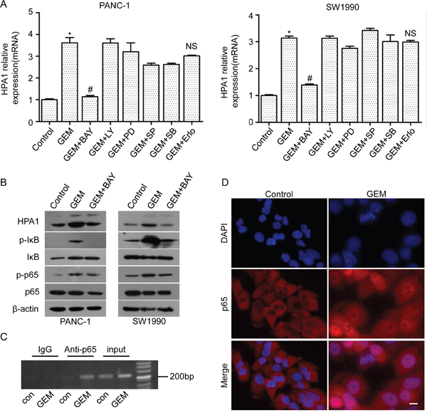 Figure 4: The involvement of NF-κB signaling in gemcitabine-induced HPA1 expression. PANC-1 cells and SW1990 cells were pretreated with BAY 11-7082 (10 μM), LY294002 (5 μM), PD98059 (5 μM), SP600125 (10 μM), SB203580 (10 μM) or erlotinib (5 μM) for 2 h and then treated 10 μM gemcitabine for 24 h. (A) mRNA levels of HPA1 were detected by qRT-PCR. *p < 0.001 compared with control. #p< 0.001 compared with GEM. NS: non-significant compared with GEM. (B) Western blot analysis was used to test the protein levels of HPA1, phospho-IκB, IκB phospho-p65 and p65 in PC cells pretreated with BAY11-7082. (C) Chromatins from PANC-1 cells treated with or without gemcitabine (10 μM) for 48h were isolated and subjected to chromatin immunoprecipitation analysis and revealed that gemcitabine promoted p65 binding with HPA1 promoter. (D) PANC-1 cells were treated with 10 μM gemcitabine for 48h. Immunofluorescence analysis showed that gemcitabine treatment promoted the nuclear translocation of p65. Scale bar, 20 μm.