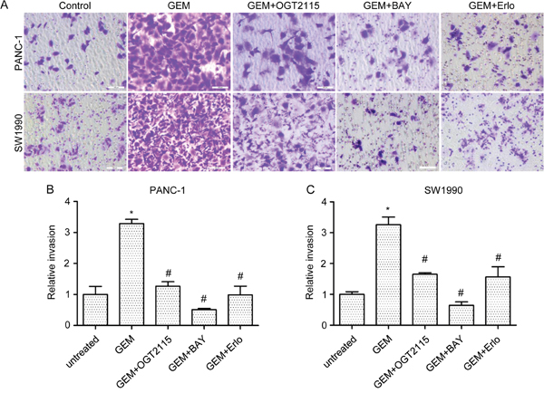 Figure 5: HPA1 inhibitor attenuates gemcitabine-induced invasiveness of PC cells in vitro. (A) In vitro cell invasion of PANC-1 and SW1990 cells treated with gemcitabine (10μM, 24 hours) alone or in combination with OGT2115 (1 μM), BAY 11-7082 (10 μM) or erlotinib (5 μM). Invaded cells were stained with 0.1% crystal violet and examined by light microscopy (B). Invasion ability of (B) PANC-1 and (C) SW1990 cells was determined by counting the cells invaded to the lower chamber. Scale bar, 100 μm. *p < 0.001 compared with untreated.#p< 0.001 compared with GEM.