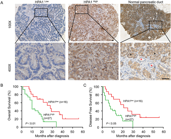 Figure 6: HPA1 is of negative prognostic value for PC patients. (A) Immunohistochemistry analysis was performed on paraffin-embedded tissue microarray of 43 patients with pancreatic cancer using the primary antibody against HPA1. Representative images of immunohistochemical staining showing low expression of HPA1 in well differentiated PC tissue (left panel) and high expression of HPA1 in poorly differentiated PC tissue (middle panel). HPA1 staining in normal pancreatic duct cells were indicated by red asterisk and pancreatic acinar cells were indicated by black asterisk (right panel). (B) Kaplan-Meier analysis of overall survival of PC patients with high or low expression of HPA1. (C) Kaplan-Meier analysis of disease free survival of PC patients with high or low expression of HPA1. Scale bar, 50 μm.