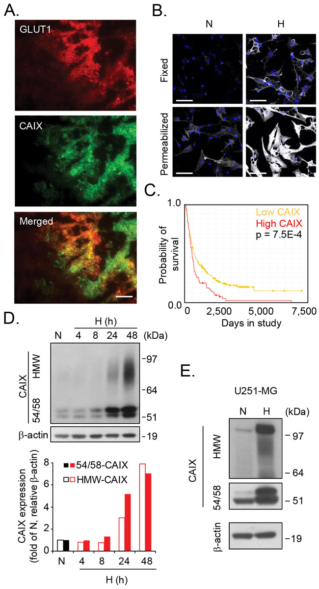 Figure 1: Identification of a heterogeneous, high molecular weight variant of CAIX. (A), Immunofluorescence staining of human glioblastoma tumor sections shows partial co-localization of GLUT1 (red) and CAIX (green) in merged images (yellow). Data shown are representative of three different tumors and at least five sections each. Scale bar, 50 µM. (B), Confocal microscopy imaging of U87-MG glioblastoma cells grown under normoxic (N) or hypoxic (H) conditions for 72 h. Fixed (upper panel) and permeabilized cells (lower panel) were stained for CAIX (white) and Hoechst nuclear stain (blue). Scale bar, 50 µM. (C), Kaplan-Meier survival plot for glioma patients with high CAIX gene expression (3≥-fold up-regulation, red line, n=50, compared with low CAIX, yellow line, n=342) demonstrates a correlation of high CAIX expression with worse patient outcome (p=0.00006). (D), U87-MG cells were grown under normoxic (24 h) or hypoxic conditions for the indicated time periods. Upper panel: Immunoblotting for CAIX reveals a new CAIX variant. Lower panel: Quantitative data of CAIX/β-actin ratios of high molecular weight CAIX (HMW-CAIX) and 54/58 kDa CAIX (54/58-CAIX) at normoxia and various periods of hypoxia. (E), U251-MG glioblastoma cells were grown under normoxic or hypoxic conditions for 48 h, and cell lysates were analyzed for CAIX and β-actin expression by immunoblotting. (D, E) Shown are representative immunoblots from three independent experiments.