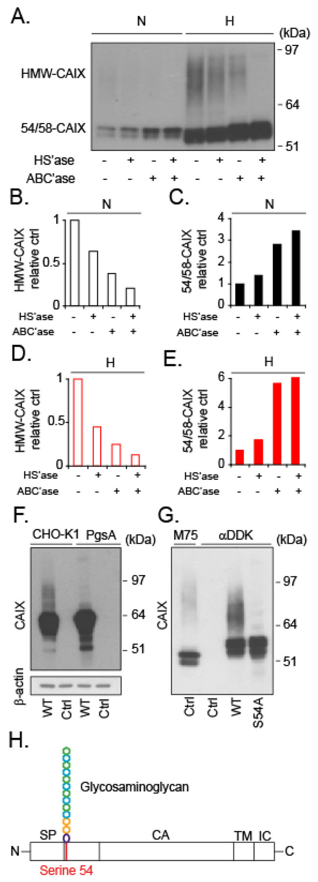 Figure 2: Evidence of glycosaminoglycan modification with CS or HS at serine 54 of CAIX. (A), Cell lysates from normoxic (N) or hypoxic (H) U87-MG cells were submitted to anion exchange chromatography and were then either untreated or digested with heparinase III (HS’ase) and/or chondroitinase ABC lyase (ABC’ase), as indicated. The digest products were separated by SDS PAGE, and CAIX was visualized by immunoblotting. (B-E) Densitometry measurements of high molecular weight CAIX (HMW-CAIX) (B and D) and 54/58-CAIX (C and E) in normoxic (B and C) and hypoxic cells (D and E), from experiment shown in (A). Quantitative data are related to the corresponding untreated HMW-CAIX and 54/58-CAIX, respectively (set to 1). (F), Wild-type (CHO-K1) and mutant PG-deficient (PgsA) CHO cells were transfected with plasmid encoding human wild-type CAIX (WT), and analyzed for CAIX expression by immunoblotting with α-CAIX (M75) that does not cross-react with endogenous hamster CAIX, as shown by the absence of signal in untransfected cells (Ctrl). (G), Wild-type (WT) plasmid encoding CAIX fused with an DDK-tag (FLAG-tag) was modified by exchanging serine 54 into alanine by site directed mutagenesis (S54A-CAIX plasmid). U87-MG cells were transfected with either the WT or S54A-CAIX plasmid (S54A) and CAIX was captured by anti-DDK antibody immunoprecipitation, as indicated. Untransfected cells (Ctrl) were subjected to M75 or anti-DDK immunoprecipitation to visualize endogenous CAIX and to exclude unspecific binding to the anti-DDK antibody, respectively. In all cases, lysates were analyzed for CAIX by immunoblotting with the M75 antibody. (H), Schematic representation of CAIX, showing the position of CS or HS GAG attachment at serine 54 (red line) in relation to the domain organization of CAIX; signal peptide (SP); catalytic domain (CA); intracellular domain (IC); and transmembrane domain (TM). (A, F), and (G) Data shown are representative of at least two independent experiments.