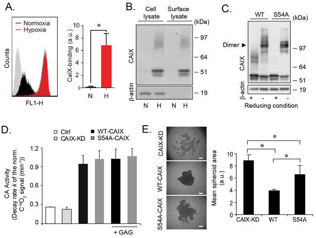 Figure 3: GAG substitution of CAIX regulates cell aggregation by mechanisms independent on the dimerization or catalytic activity of CAIX. (A), FACS quantification of cell-surface CAIX in U87-MG cells grown at normoxic (N) or hypoxic (H) conditions for 48 h. Left panel: Representative histograms; grey area shows control cells without antibody labelling. Right panel: Quantitative analysis presented as the mean ± S.D. from two independent experiments each performed in triplicates. *p<0.05. (B), U87-MG cells were grown under normoxic or hypoxic conditions for 48 h followed by cell-surface biotinylation as described in Methods. Total cell lysate and biotinylated surface proteins were analyzed for CAIX and β-actin by immunoblotting. (C), No role of GAG conjugation in CAIX dimerization: WT-CAIX and S54A-CAIX cell lysates were analyzed for CAIX by immunoblotting at reducing and non-reducing conditions with β-actin as loading control. (D), Equal amounts of CAIX-KD, WT and S54A-CAIX cell lysates or PBS (Ctrl) were analyzed for CA activity in the absence or presence of 100 µg/mL GAG by membrane-inlet mass spectrometry analysis. Data are presented as the mean ± SD from two independent experiments. (E), U87-MG CAIX-KD, WT-CAIX and S54A-CAIX cell aggregation at hypoxia. Left panel: Representative images from three independent experiments. Right panel: Quantification of cell aggregate area, which is inversely related to 3D structure forming capacity, using ImageJ. Data are presented as the mean ± SD. *p<0.05.