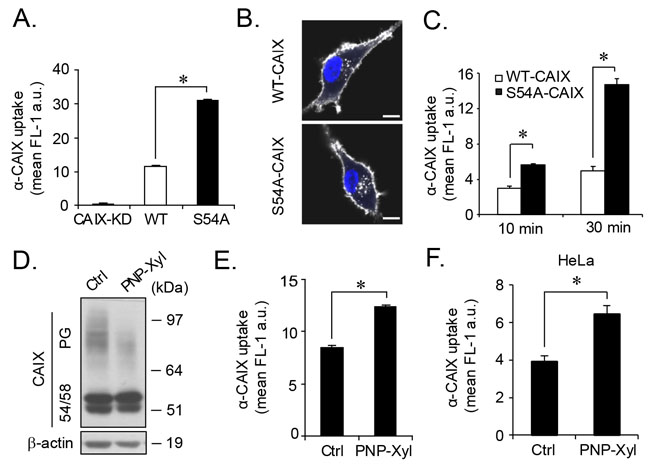 Figure 4: Increased CAIX internalization by genetic or pharmacological depletion of glycosaminoglycan modification. (A), FACS quantification of α-CAIX internalization continuously for 1 h in normoxic CAIX-KD, WT-CAIX and S54A-CAIX cells. (B), Representative confocal microscopy images of WT-CAIX and S54A-CAIX cells from experiment described in (A). Scale bar, 10 μm. (C), α-CAIX was bound to the surface of normoxic WT-CAIX and S54A-CAIX cells on ice, followed by extensive washing, and α-CAIX internalization for 10 and 30 min at 37°C was assessed by FACS. (D), U87-MG cells were either untreated (Ctrl) or treated with PNP-Xyl for 48 h in hypoxia, and cell lysates were analyzed for CAIX and β-actin expression by immunoblotting. (E), U87-MG cells were treated as in (D) followed by α-CAIX internalization for 1 h, as evaluated by FACS analysis. (F), Similar experiment as in (E) was performed with HeLa cells. Data are presented as the mean ± SD from three (A, E) or two (C, F) independent experiments, each performed in triplicates. *p<0.05.
