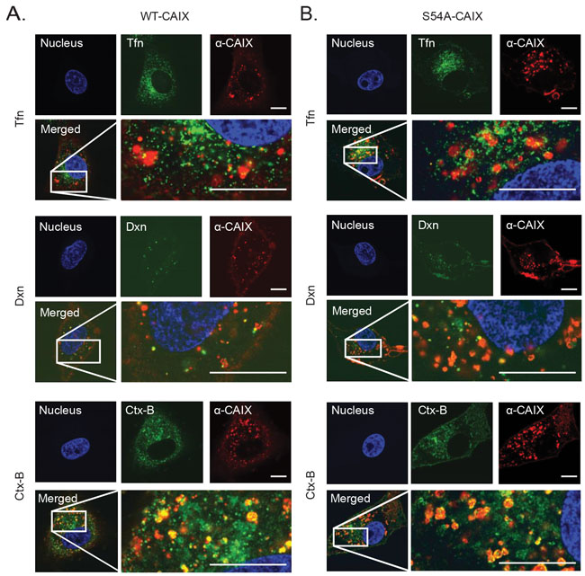 Figure 5: CAIX mainly follows a lipid raft-mediated endocytic pathway. WT-CAIX (A), and S54A-CAIX (B) cells were incubated with α-CAIX (red), and transferrin (Tfn; green), dextran (Dxn; green) or cholera cytotoxin subunit B (Ctx-B; green). Nuclei were counter-stained with Hoechst (blue). Merged images display strong co-localization of α-CAIX with Ctx-B (yellow signals). All images were captured on an Airyscan super resolution imaging system integrated with Zeiss 710 confocal microscope using a C-Apochromat 63X/1.20W korr M27 objective. Scale bars, 50 µM. Shown are representative images from three independent experiments, each performed in duplicate.