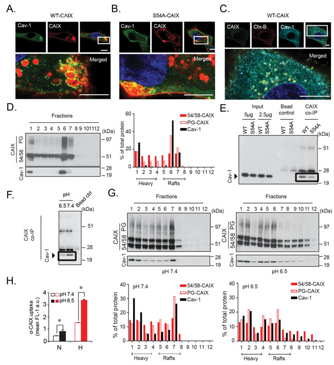 Figure 6: Glycosaminoglycan modification attenuates CAIX internalization through an increased association with caveolin-1 in acidosis-sensitive, lipid raft domains. WT-CAIX (A), and S54A-CAIX (B) cells were incubated with α-CAIX (red), and then stained for caveolin-1 (Cav-1; green) and nuclei (blue). In WT-CAIX cells, merged images display localization of α-CAIX mainly within caveolin-1 positive structures. (C), WT-CAIX cells were co-incubated with α-CAIX (green) and Ctx-B (red), and then stained for caveolin-1 (turquoise) and nuclei (blue). Merged image shows α-CAIX and Ctx-B co-localization within caveolin-1 positive structures. Images were captured by super resolution fluorescence microscopy. (D), Hypoxic parental U87-MG cells were subjected to subcellular sucrose density ultracentrifugation, followed by immunoblotting for CAIX and caveolin-1 in membrane density fractions. Right panel: Densitometry of caveolin-1, PG-CAIX, and 54/58-CAIX expressed as % of total protein in all fractions. “Heavy” and “Rafts” refer to high density (non-raft) and low density (raft) membrane fractions. (E), Immunoblotting for caveolin-1 in WT-CAIX and S54A-CAIX total cell lysates (input) or following immunoprecipitation with α-CAIX (CAIX co-IP; equal protein loading). Bead control is without primary α-CAIX. (F), Similar experiment as in (E) with WT-CAIX cells pre-incubated for 3 h at neutral (pH 7.4) or acidic (pH 6.5) conditions. (G), Hypoxic parental U87-MG cells were incubated at neutral (left panels) or acidic (right panels) conditions, and subjected to subcellular fractionation, immunoblotting, and densitometry measurements of caveolin-1, PG-CAIX, and 54/58-CAIX (lower panels) as in (D). Microscopy images and immunoblots are representative of at least three independent experiments. Scale bars, 10 µM. (H), FACS quantification of α-CAIX internalization in normoxic (N) and hypoxic (H) parental U87-MG cells following pre-treatment at pH 7.4 or 6.5. Data are presented as the mean ± SD. *p<0.05.