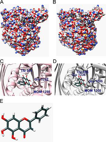 Figure 1: Molecular docking. (A) The binding model of rat source XOR-baicalein complex (XOR is shown using a surface model and baicalein is shown using a ball and stick model). (B) The binding model of human source XOR-baicalein complex (XOR is shown using a surface model and baicalein is shown using a ball and stick model). (C) The insight model of rat source XOR-baicalein complex. (D) The insight model of human source XOR-baicalein complex. (E) Molecular structure of baicalein.