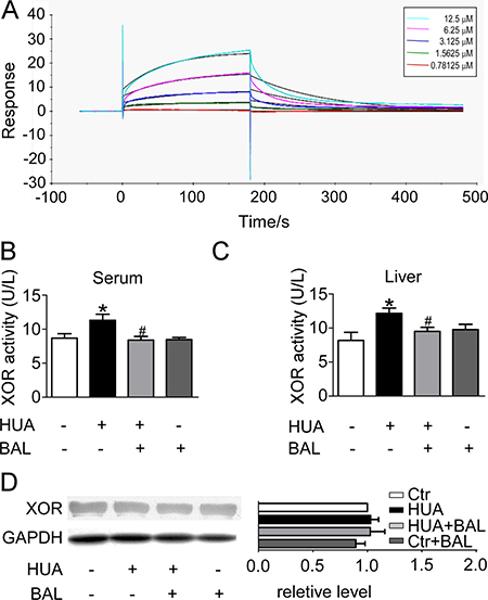 Figure 2: Binding affinity of baicalein to XOR as determined by SPR, and the inhibitory effect of baicalein to XOR in hyperuricemia mice in vivo. (A) Real-time measurements of the binding affinity of baicalein to XOR were performed using a Biacore 3000 instrument. Baicalein at a concentration of 0.78125, 1.5625, 3.125, 6.25 or 12.5 μM (curves from bottom to top) was injected. (B) ICR male mice were intraperitoneally administered with hypoxanthine and potassium oxonate daily to establish hyperuricemia model. Baicalein was orally given to some mice. Blood samples were collected for evaluating enzymatic activity of XOR. (C) Liver tissues were homogenized for evaluating enzymatic activity of XOR. Values were means ± SEM (n = 5–6). *P < 0.05 vs. control group. #P < 0.05 vs. hyperuricemia group. (D) Expression levels of XOR in liver were determined by western blots (left) and quantifications (right), which were normalized with GAPDH. Means ± SEM (n = 3).