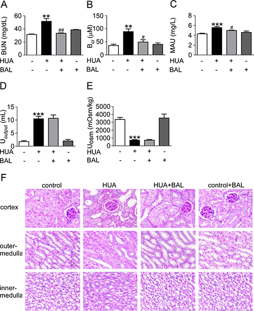 Figure 4: Baicalein improved renal function and kidney pathology in hyperuricemia mice. Blood, urine and kidney samples were collected for renal function tests and histological examination. (A) BUN. (B) Blood creatinine. (C) Urine microalbumin. (D) Urine output. (E) Urine osmolality. (F) Photomicrographs illustrated periodic acid–Schiff staining of the kidney tissues in control or hyperuricemia mice with or without baicalein treatment (magnification 200×). Values were means ± SEM (n = 5–6). *P < 0.05, **P < 0.01 and ***P < 0.001 vs. control group. #P < 0.05, ##P < 0.01 vs. hyperuricemia group.