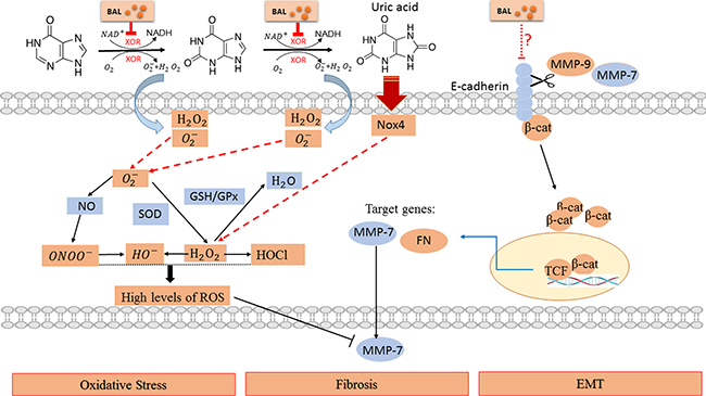 Reactivating and hyperactive β-catenin signaling is detrimental in glomeruli and tubules. Moreover, genetic and pharmacologic activation of β-catenin may cause proteinuria [57, 58]. Accordingly, we have confirmed the activation of β-catenin and proteinuria in our hyperuricemia mice. MMP-7 and MMP-9 were also involved in β-catenin signal. They can promote degradation of E-cadherin, and the process leads to β-catenin release and activation [59, 60]. At the same time, the stabilization and nuclear translocation of β-catenin stimulated the transcription of target genes in kidney, including fibronectin and MMP-7 itself as well [61]. As only MMP-9 level was elevated, we thought that maybe MMP-9 played a more important role in this pathway. Based on previous reports, the decreased MMP-7 level might be concerned with the overproduction of ROS (Figure 7).