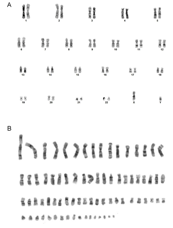 Figure 1: Representative karyotypes of a virally transformed lymphocyte from a normal individual (GM06865) (A), and of an osteosarcoma cell line (U2OS) with CIN (B). Unlike the diploid normal lymphocyte, the aneuploidy U2OS cell karyotype is highly abnormal with many chromosomes showing such an abnormal G-banding pattern that they could not be reliably assigned.