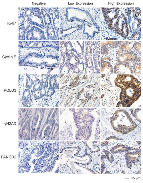 Figure 2: Representative IHC images of the expression of Ki-67, Cyclin E, POLD3, γH2AX, and FANCD2 in colon cancer FFPE specimens.