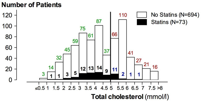 Figure 1: Histogram plot of the number of patients according to total cholesterol level. Values ≥5mmol/l are diagnostic of HCE (vertical black line) and the subset of patients with statin is indicated by filled columns. The colors reflect the 4 subgroups: red (group A, HCE no statins), blue (group B, HCE despite statins), black (group C, normocholesterolemia with statins), and green (group D, normocholesterolemia without statins).