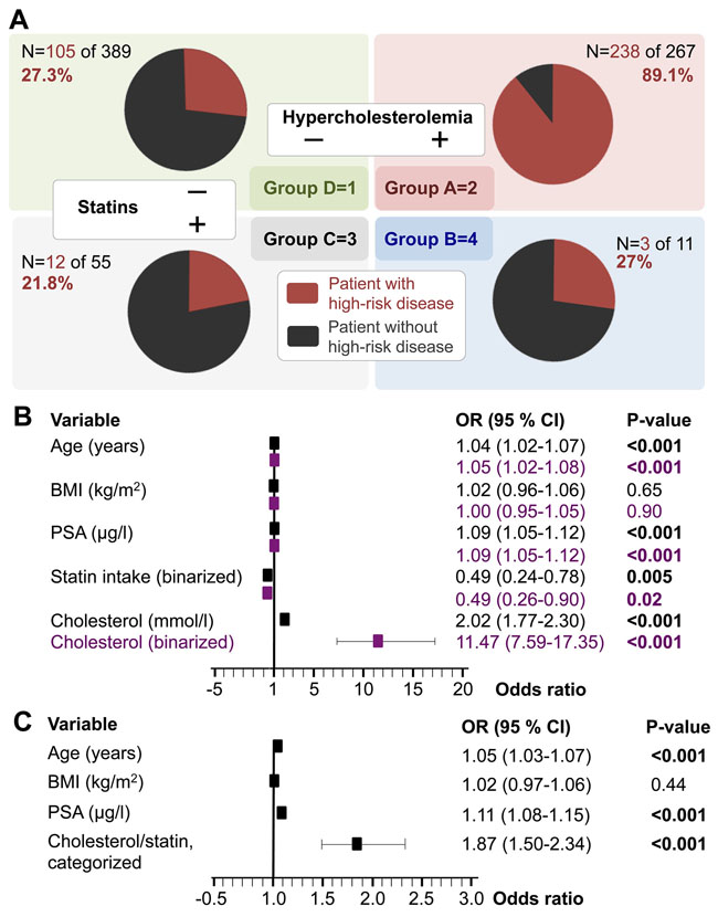 Figure 4: Preoperative serum cholesterol and statin intake as surrogate markers for postoperative high-risk prostate cancer. (A). The study cohort is separated into patient with or without HCE (defined as ≥5mmol/l) and with or without statin intake. The figure shows the breakdown of high-risk prostate cancer patients (red), defined as pT≥3a and/or pN1 and/or Gleason score ≥7b in each subset. (B) Results of two multivariate logistic regression models accounting for cholesterol either as a continuous- (mmol/l in black) or a binarized variable (HCE yes vs. no in purple). (C) Results of a multivariate logistic regression analysis where serum cholesterol and statin intake are modelled as one categorical variable: D=1, A=2, C=3, B=4. Abbreviations: BMI, body mass index; CI, confidence interval; HCE, hypercholesterolemia; OR, odds ratio; PSA, prostate specific antigen.