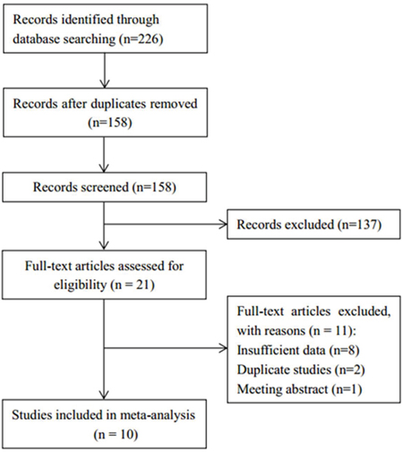 The selection process for eligible studies is presented in Figure 1. An electronic database search obtained a total of 226 records. Following the removal of duplications, 158 records were obtained. Through examination of the title and abstract, 137 records were excluded because they did not meet the inclusion criteria or were irrelevant studies. Following a review of the remaining 21 full-text articles, 11 studies were further excluded because of insufficient data (n=8), duplicate studies (n=2), and meeting abstract (n=1). Therefore, 10 eligible studies [17–26] were included in the final meta-analysis. The baseline characteristics of the included studies are shown in Table 1. The total sample size was 1605, with a range from 55-327. Seven studies [18-20, 22, 24-26] were published in English and 3 studies [17, 21, 23] were in Chinese. Eight studies [18, 19, 21–26] presented data on the relationship between CD147 and overall survival (OS) and 8 studies [17, 19-21, 23-26] reported the association between CD147 and clinical factors. All studies had Newcastle-Ottawa scale scores ≥6.