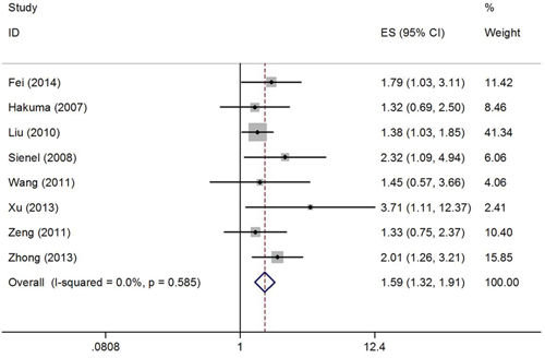 Hazard ratios (HRs) and 95% confidence intervals (CIs) regarding CD147 and OS were extracted from a total of 8 studies [18, 19, 21–26] involving 1429 patients. Because of no significant between-study heterogeneity (I2=0%, Ph=0.585), the fix effect model was used to calculate the pooled HR. The results suggested that CD147 overexpression was correlated with poor OS (HR=1.59, 95% CI=1.32–1.91, p<0.001). The results are presented as a forest plot in Figure 2.