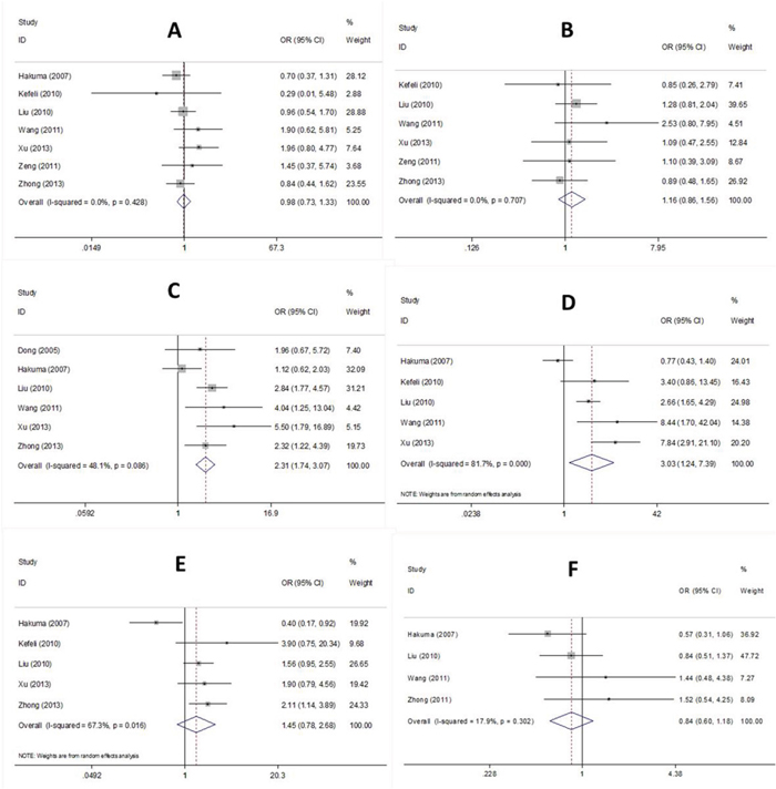 Figure 3: Forest plot of CD147 associated with (A) sex, (B) age, (C) LN metastasis, (D) TNM stage, (E) differentiation, and (F) histology in NSCLC patients.